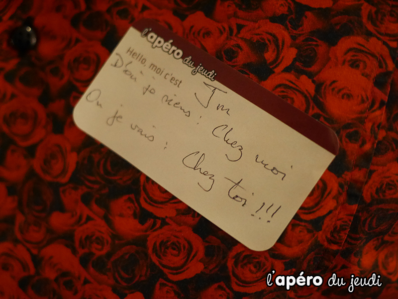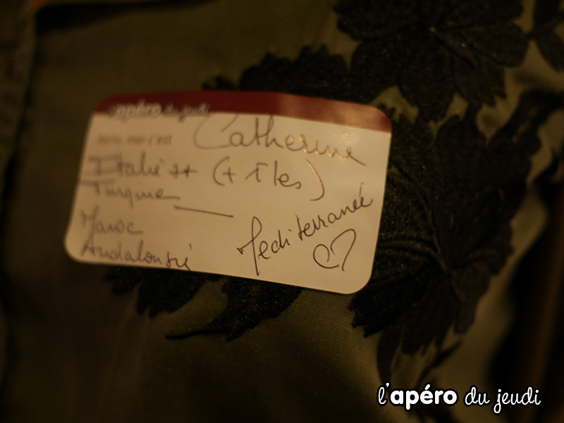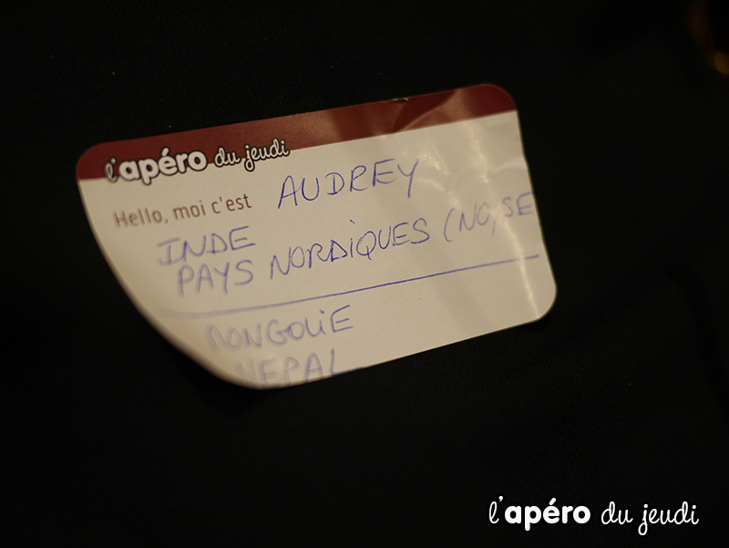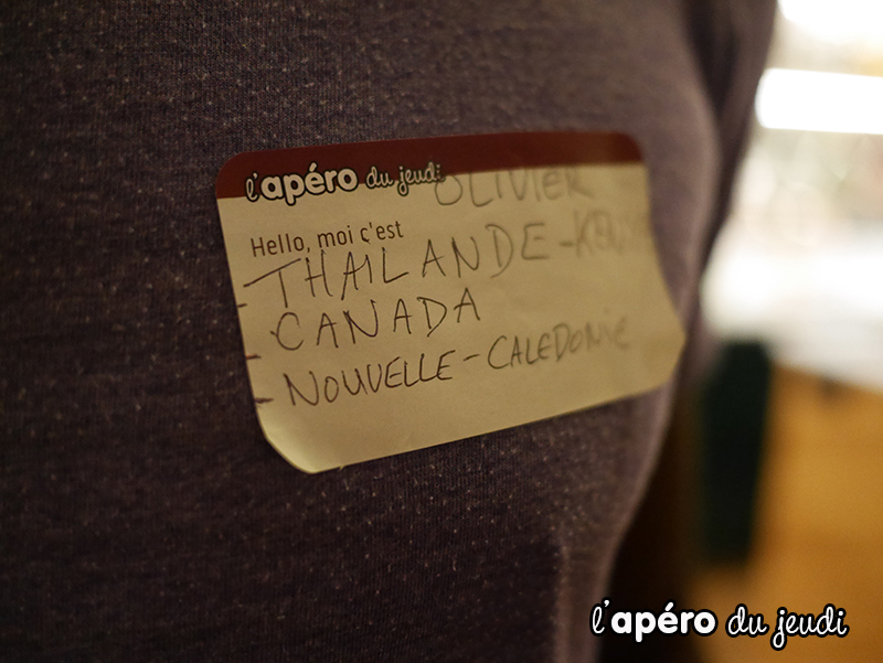 J’ai pu inaugurer nos nouvelles étiquettes Apéro du Jeudi. Je pense que je vais vous les proposer à chaque apéro : elles nous permettront de connaître le prénom de chacun en coup d’oeil ce qui sera plus facile pour engager les conversations.